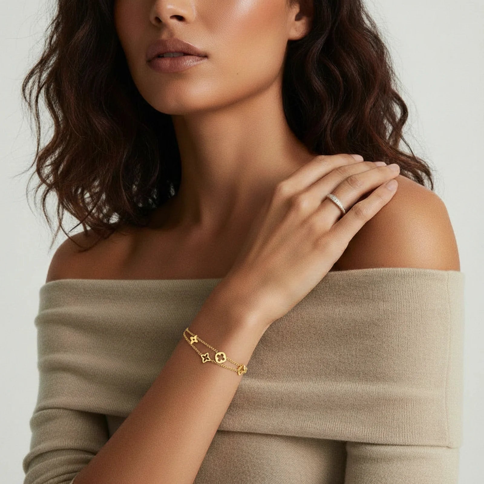 Celestial stars meet lucky clover charms in this 18K gold-plated double-chain bracelet that channels confidence and warmth.